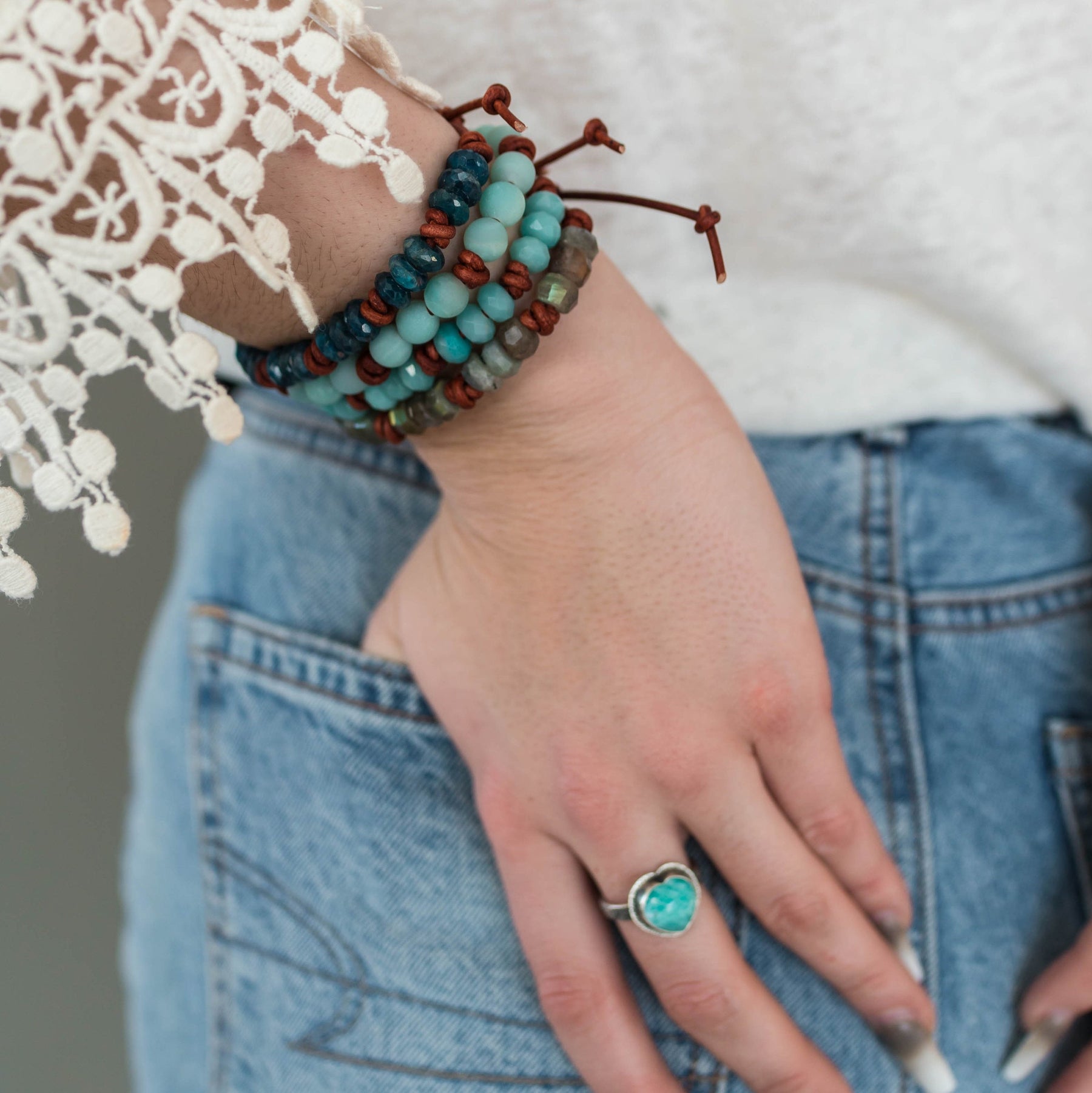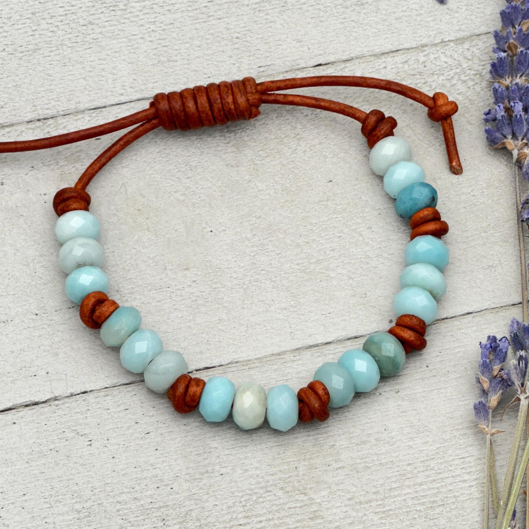 These bracelets may appear in searches for: amazonite bracelet, blue gemstone bracelet, leather stacking bracelet, brown leather bracelet, boho gemstone jewelry, adjustable leather bracelet, minimalist gemstone bracelet, amazonite jewelry for women, natural stone bracelet, bohemian stacking bracelet, rustic leather jewelry, calming gemstone bracelet, turquoise blue bracelet, gift for her bracelet, everyday stacking jewelry, earthy style bracelet, handmade leather bracelet
