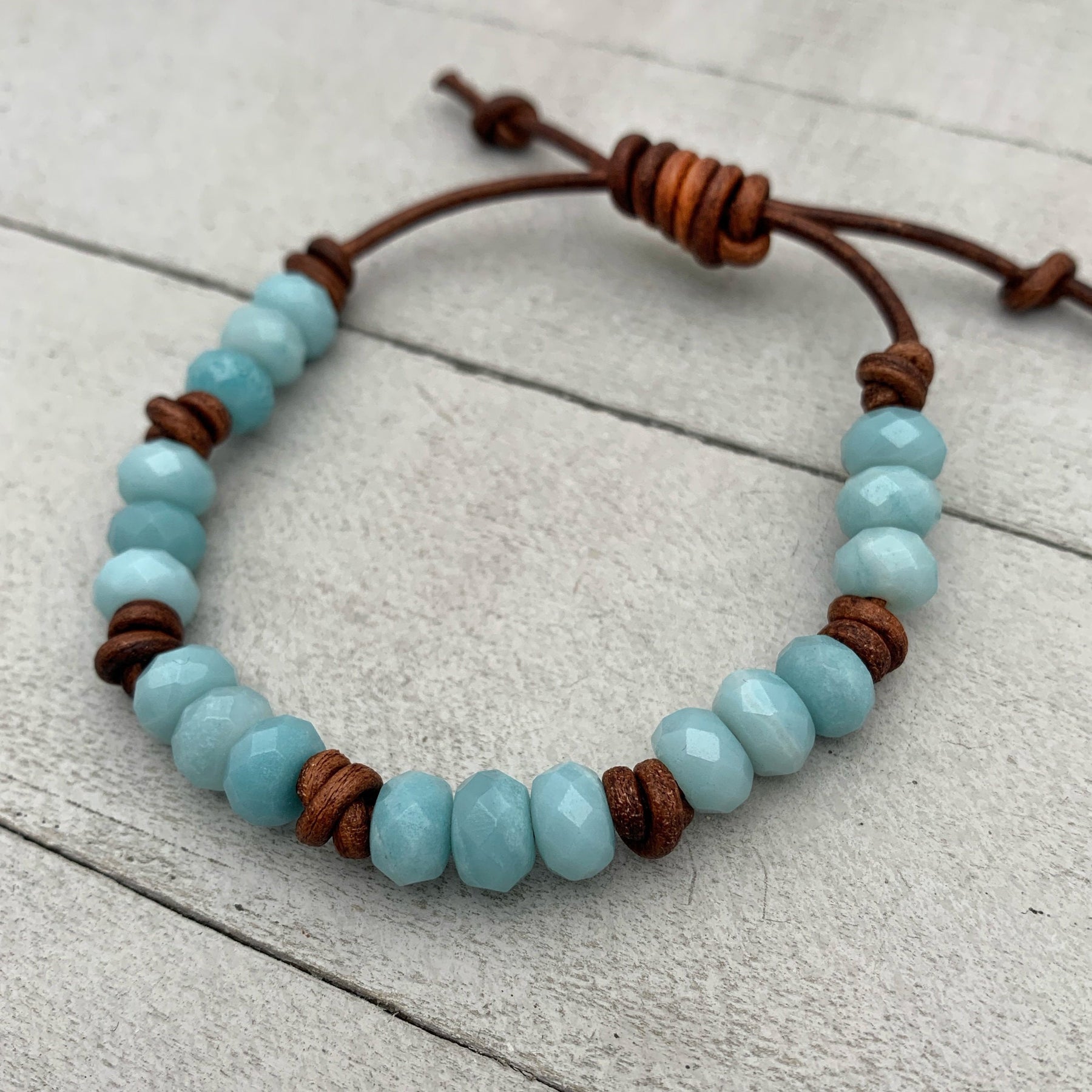 This handcrafted bracelet features faceted Amazonite gemstones in a soft, dreamy baby blue—each stone catching the light with a subtle shimmer. Set against rich brown leather, the combination creates a beautiful balance of rustic texture and modern design.
