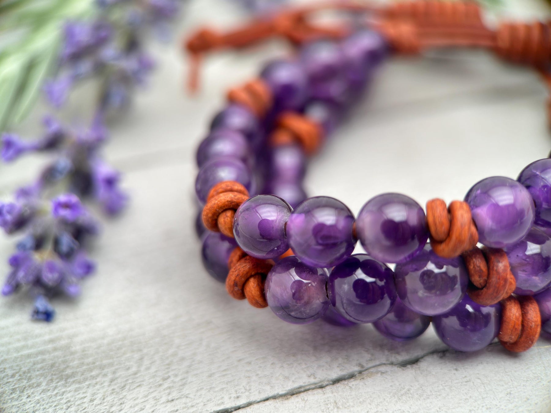 Rustic brown leather and Amethyst gemstone stacking bracelet. The Amethyst stones have a beautiful purple color. These bracelets look great alone or stacked together and with other bracelets. The classic look of gemstones with modern and edgy leather. Groups of three gemstones knotted together around a leather bracelet. Finished with a sliding knot clasp. The clasp adjusts to help you get the perfect fit.