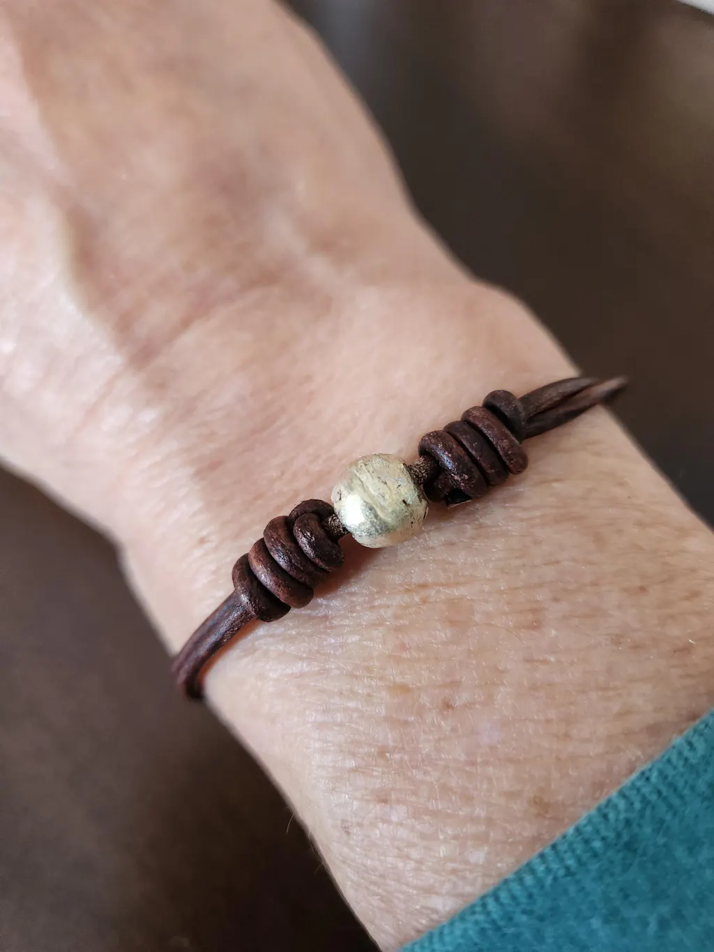A leather anklet with a single African coin silver bead. Choose from rustic brown or black leather. Each coin silver bead is handmade, unique and full of history! They are comprised of approximately 80% silver mixed with other metal alloys. Made from European coins dating from the 1800’s and early 1900’s were melted and re-fabricated to create jewelry components.