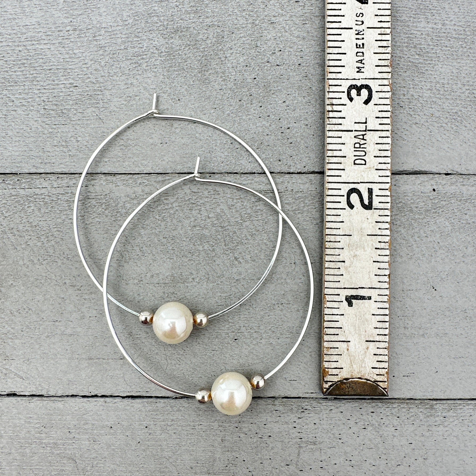 We've added silver beads and pearls to our best-selling large hoop earrings. The white freshwater pearls have a nice round shape and beautiful luster. The beads move freely on the hoops, but won't fall off. Our hoops are lightweight and thin but large and bold. They are 2 inches in diameter (side-to-side measurement).