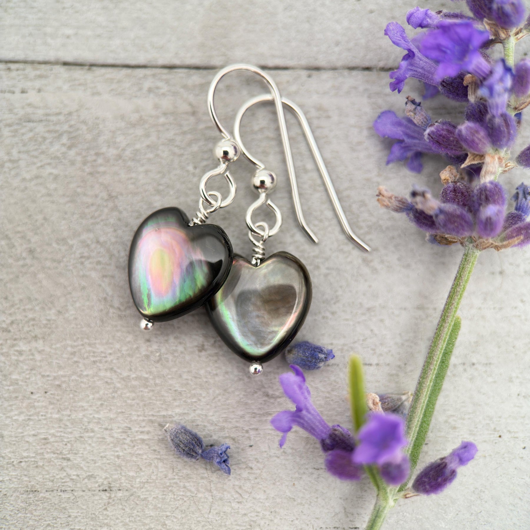 🩶 Iridescent black lip oyster shell hearts shimmer with rainbow hues in these elegant sterling silver earrings — a perfect blend of ocean beauty and timeless charm.