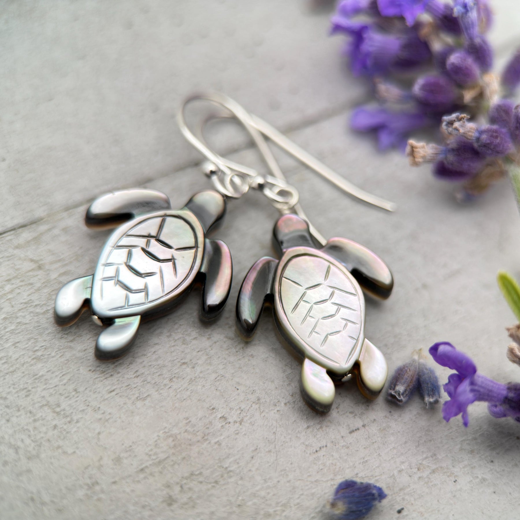 Beautiful carved sea turtle earrings made from iridescent black lip oyster shell and accented with silver pearls — a stunning symbol of strength and protection.