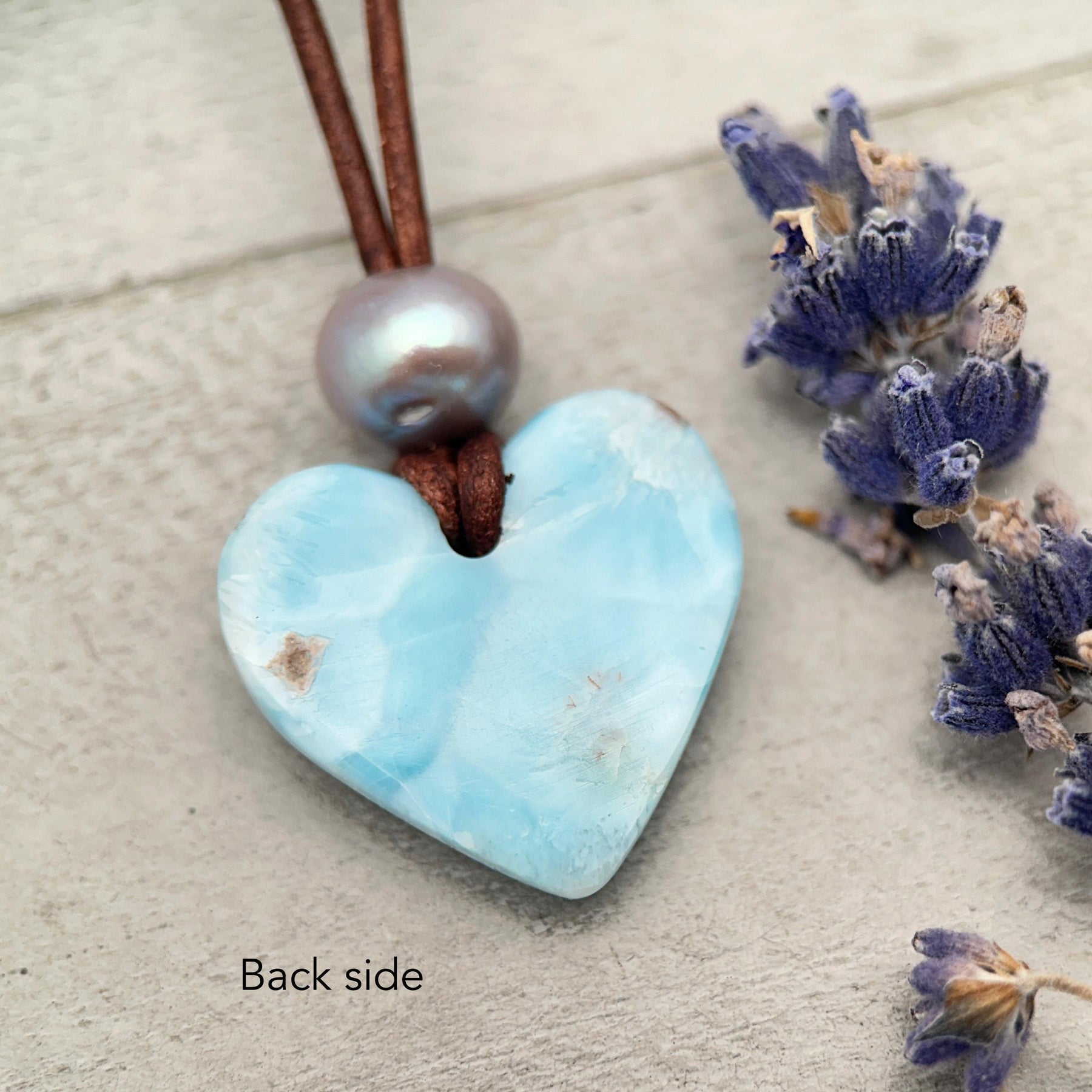 This one-of-a-kind larimar heart necklace features Caribbean-blue stone on a rustic brown leather cord with pearl accents.