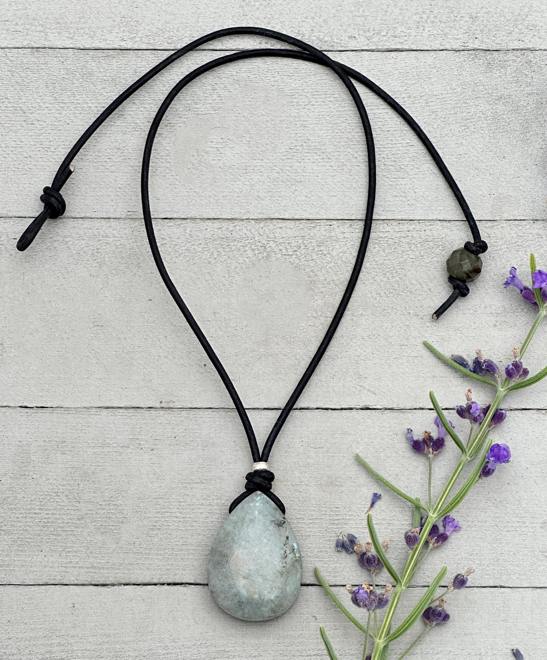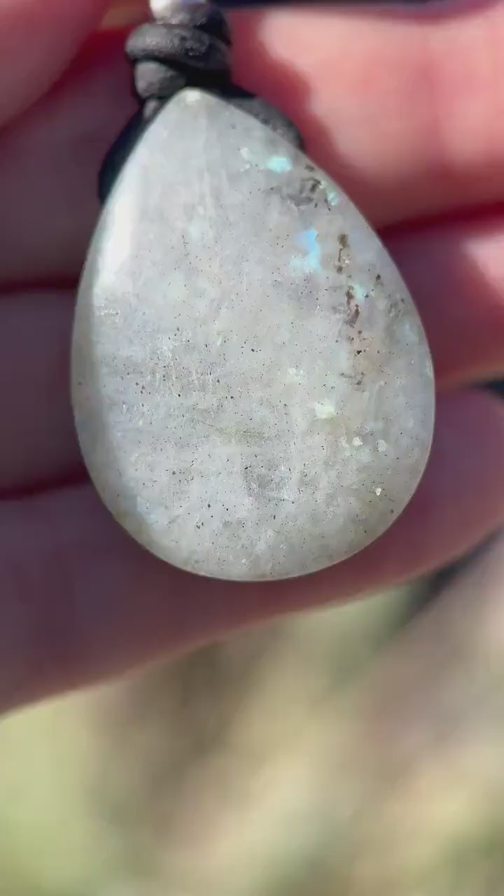Unique gray Labradorite pendant on black leather with sterling silver accents—full of iridescent flashes and natural charm.
