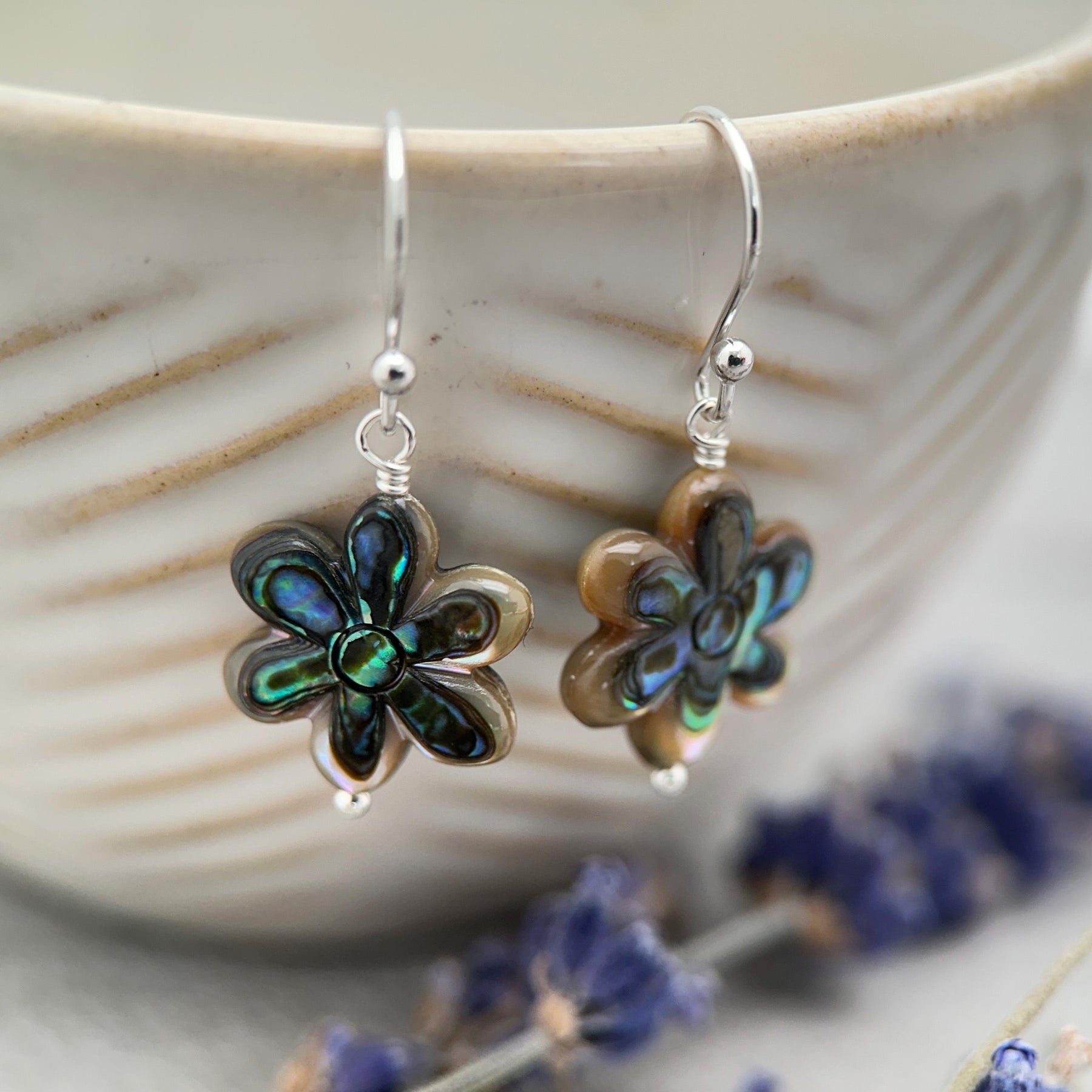 Limited Quantity! ... These elegant earrings feature flower-shaped Paua abalone shell and luminous 925 sterling silver. Each Paua shell flower is hand cut, revealing the shell’s natural mother-of-pearl nacre—a stunning blend of blues, greens, purples, and soft rainbow tones. No two flowers are exactly alike, making each pair truly one of a kind.