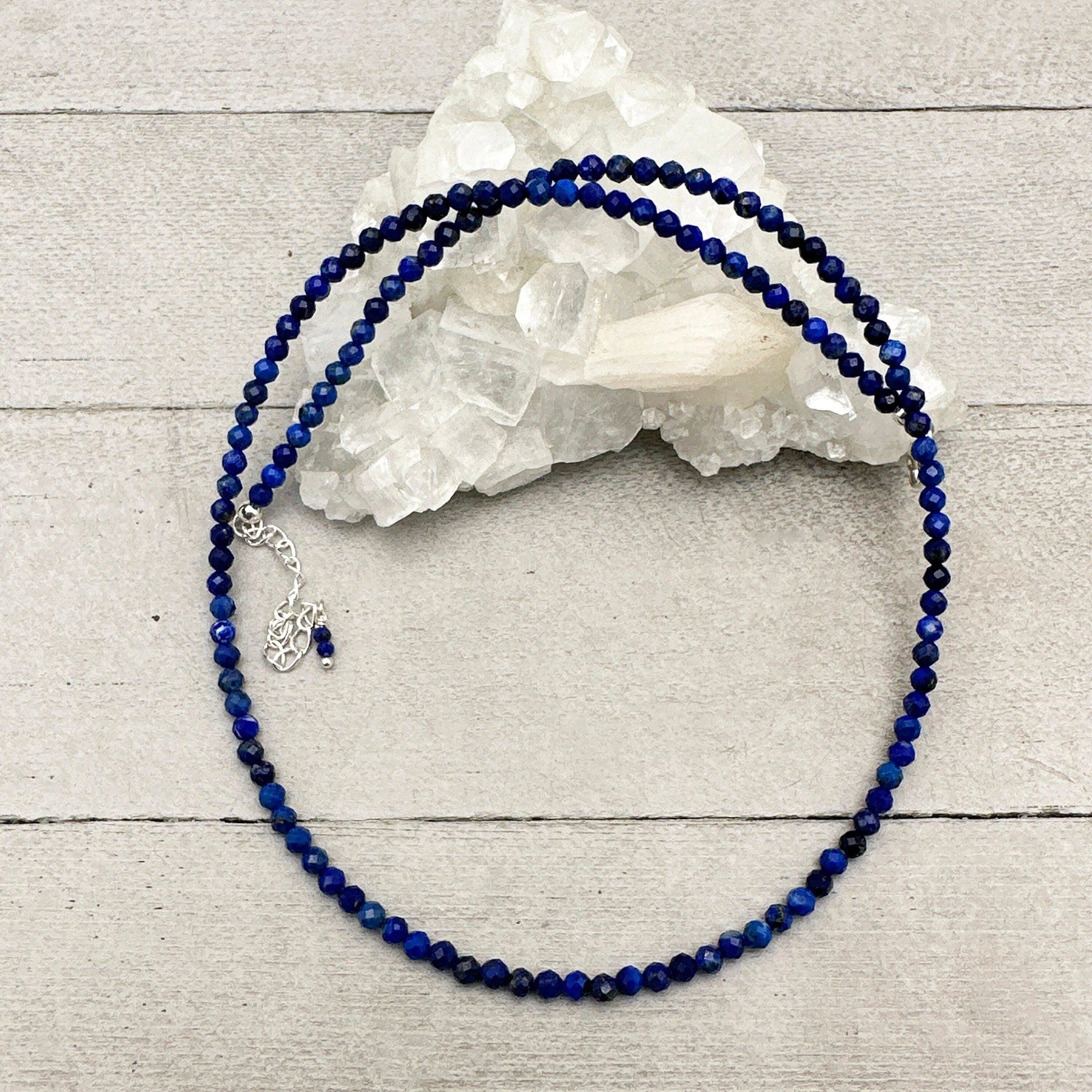 Elegant and timeless, this faceted Lapis Lazuli necklace features sparkling 3mm gemstone beads and a sterling silver clasp. Handmade in the USA, it’s perfect worn alone or layered with a pendant.
