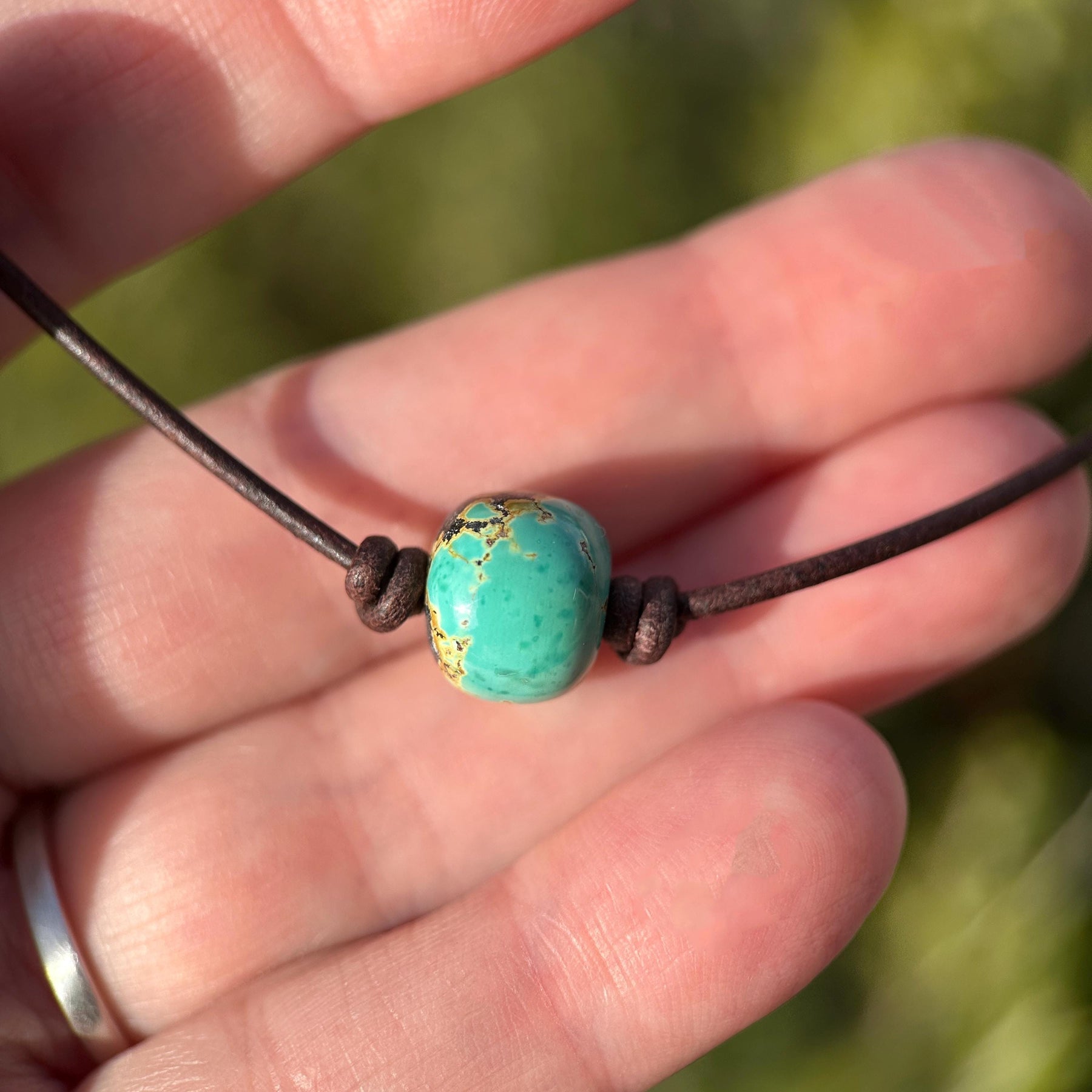 This handmade natural turquoise necklace features a thick, beautifully polished turquoise bead pendant with vibrant blue-green polychrome hues and natural brown and black matrix patterns. This multi-color turquoise even has a touch of yellow and orange to it. It is truly a unique stone! The focal stone measures 10 x 13mm (approximately 1/2 inches) and is accented rustic brown leather for a Southwest-inspired touch.