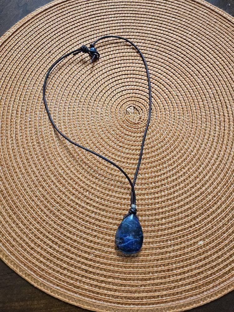 A beautiful dark blue Sodalite pendant necklace. The sodalite stones have a nice smooth polish on all sides. Accented with a faceted Karen Hill Tribe silver bead and set on a soft brown leather cord. The necklace is finished with a sodalite bead and loop clasp.