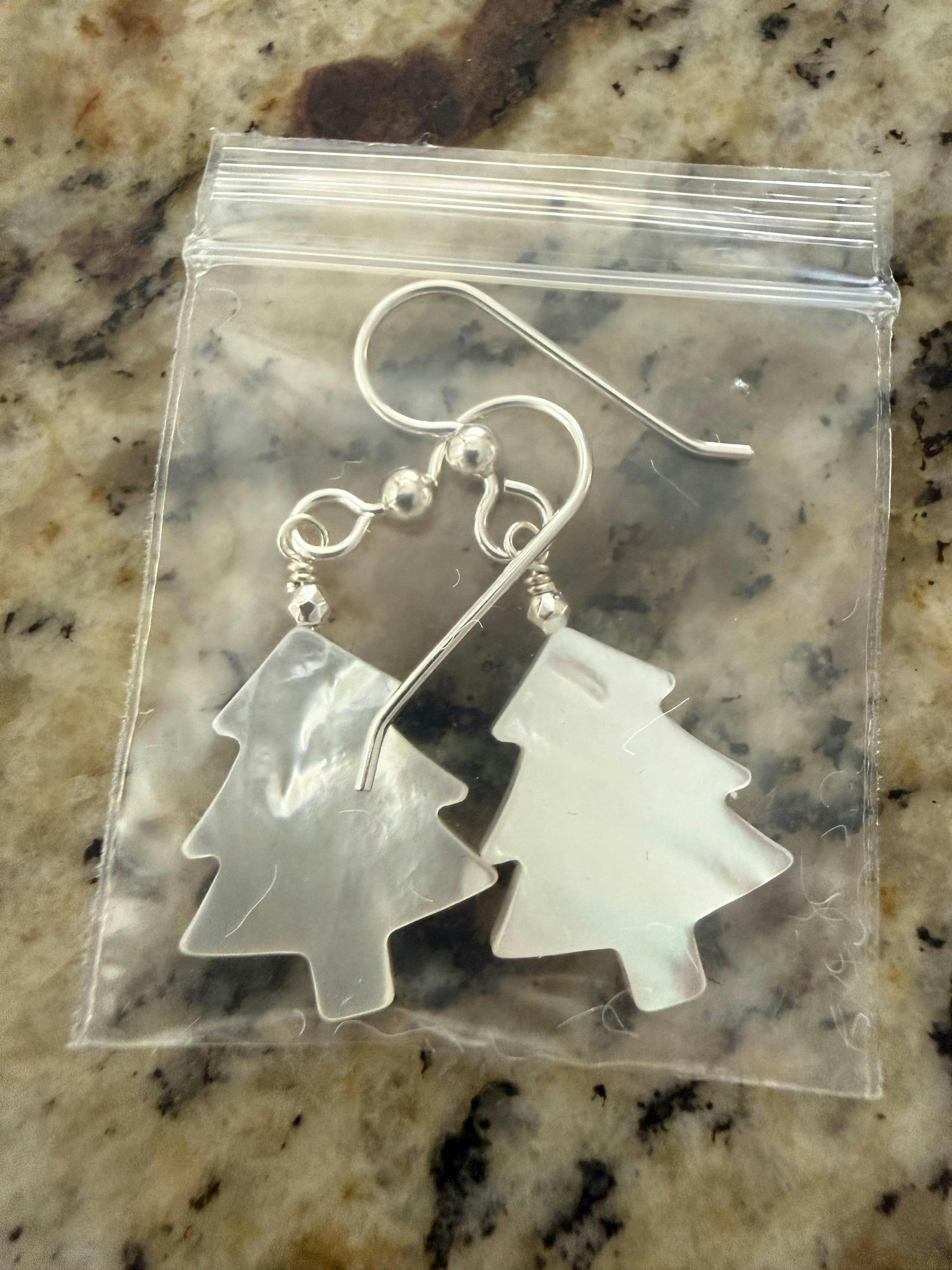 Limited edition: Shimmering Mother-of-Pearl pine tree earrings—perfect for winter outfits, holiday parties, and festive gifting.