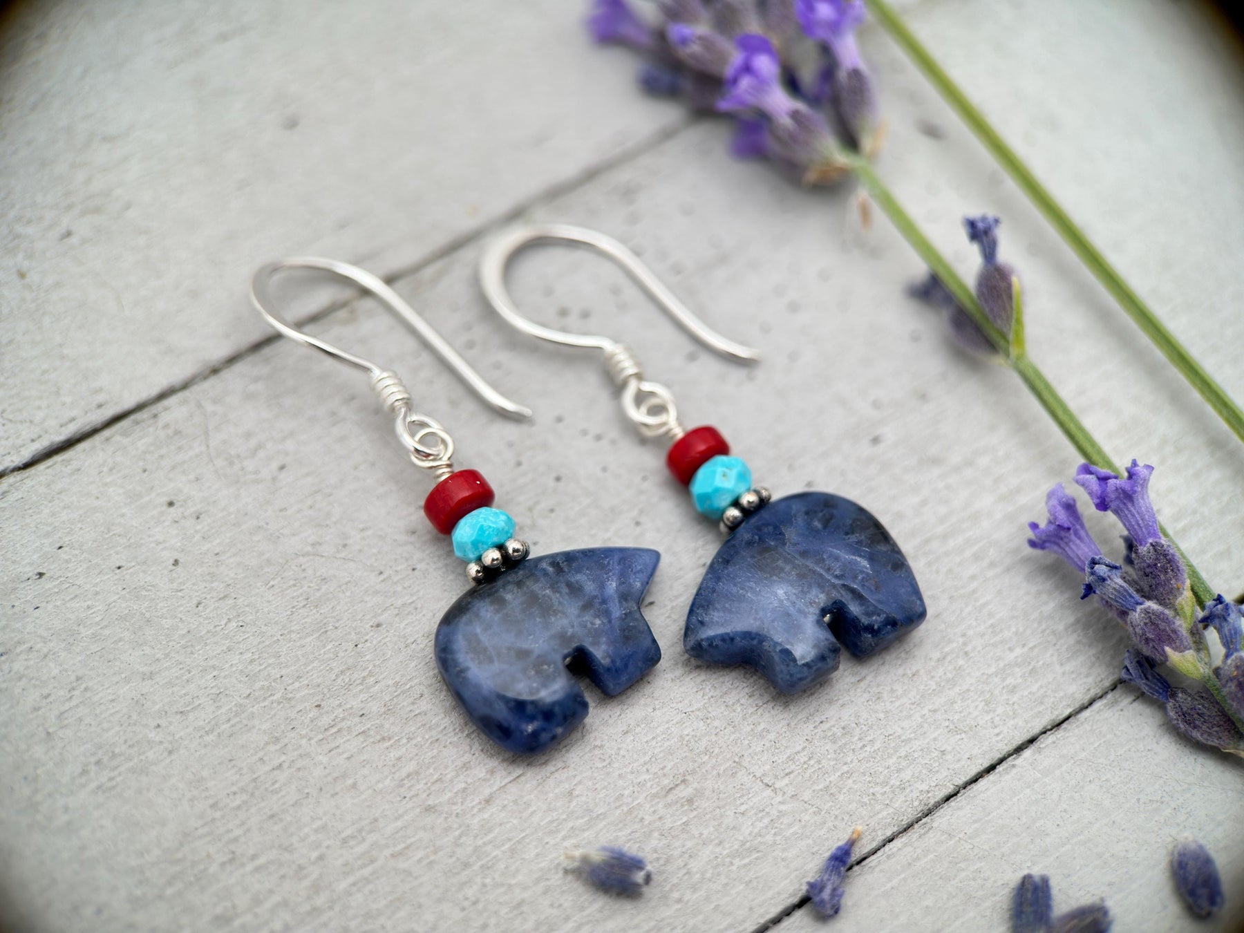 Sodalite Zuni Bear Fetish earrings. These cute Zuni bears are cut from navy blue sodalite. Each bear has beautiful blue color. Topped with bright blue Turquoise and red coral beads and sterling silver ear wires. All metal is 925 sterling silver.