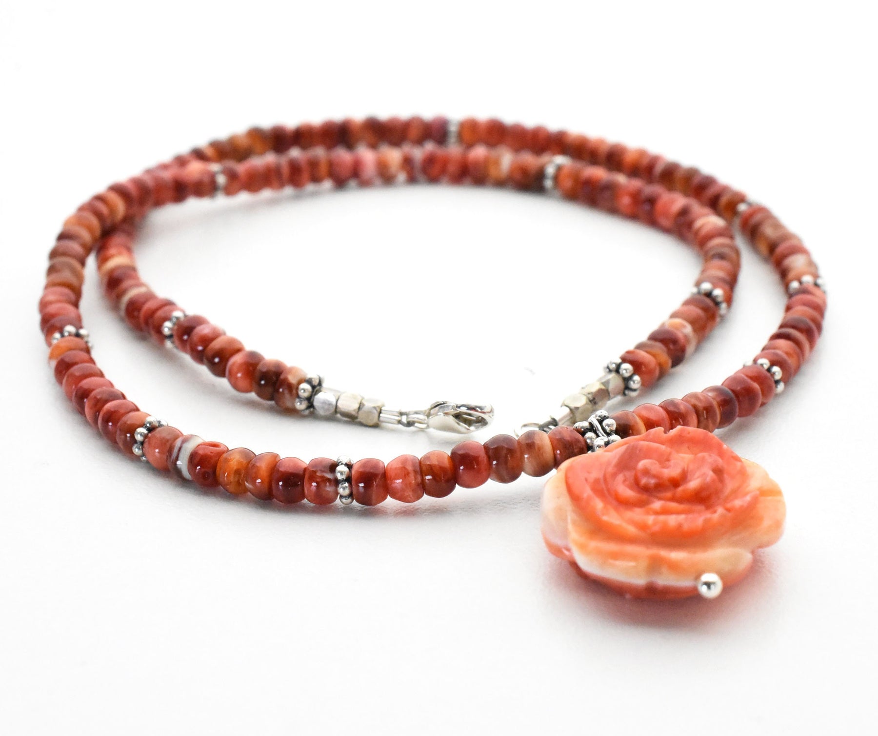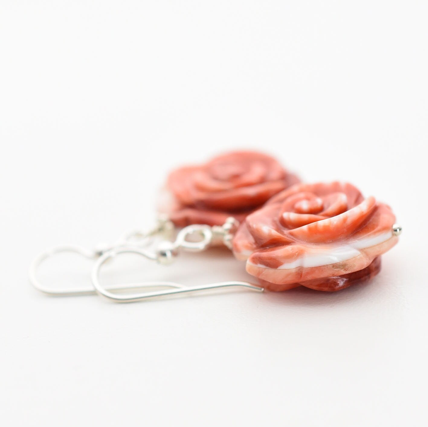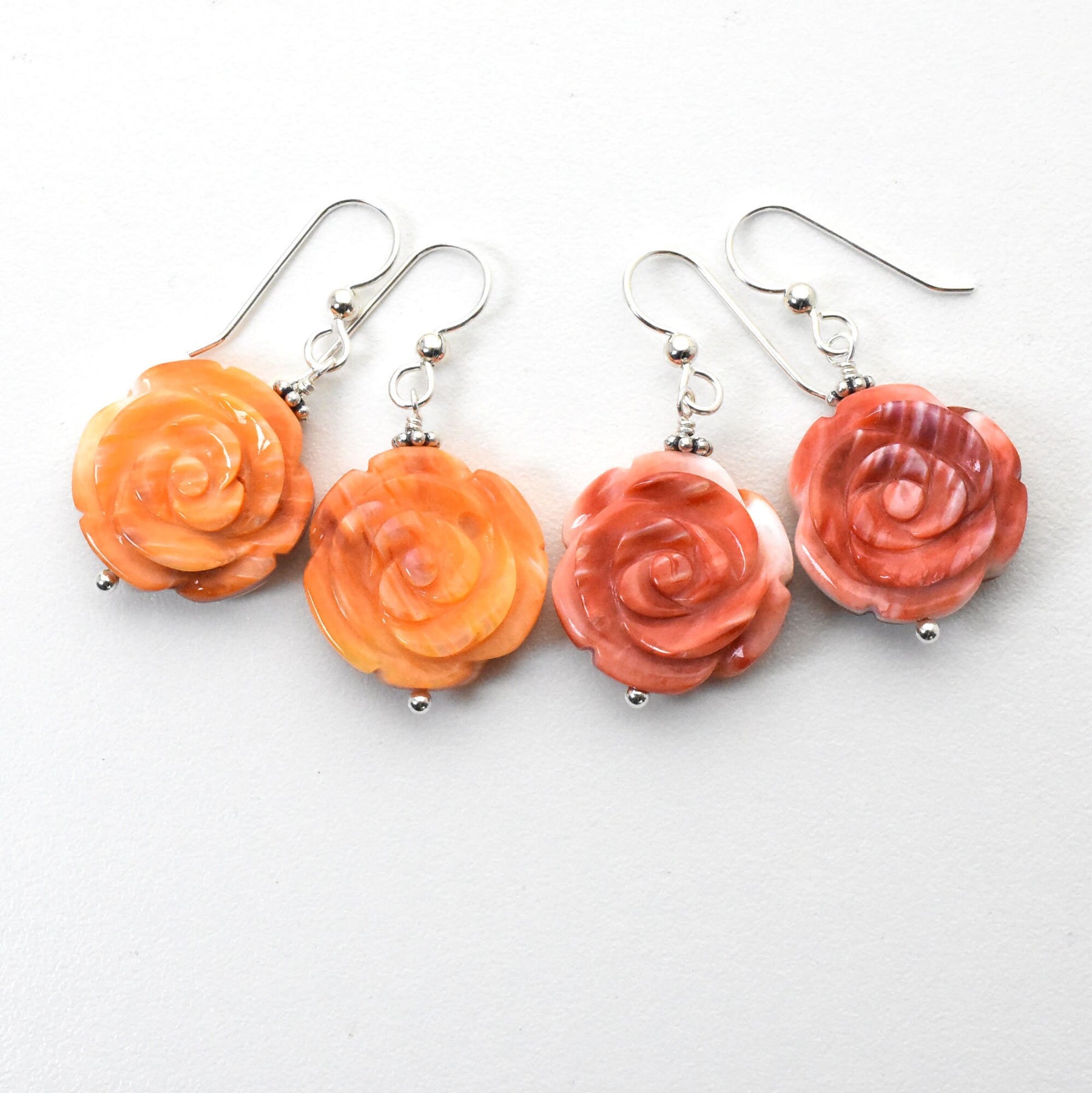 Carved spiny oyster flower earrings. The flowers are 1 inch in diameter (25mm) and are double-sided carved flowers. All metal is solid 925 sterling silver.