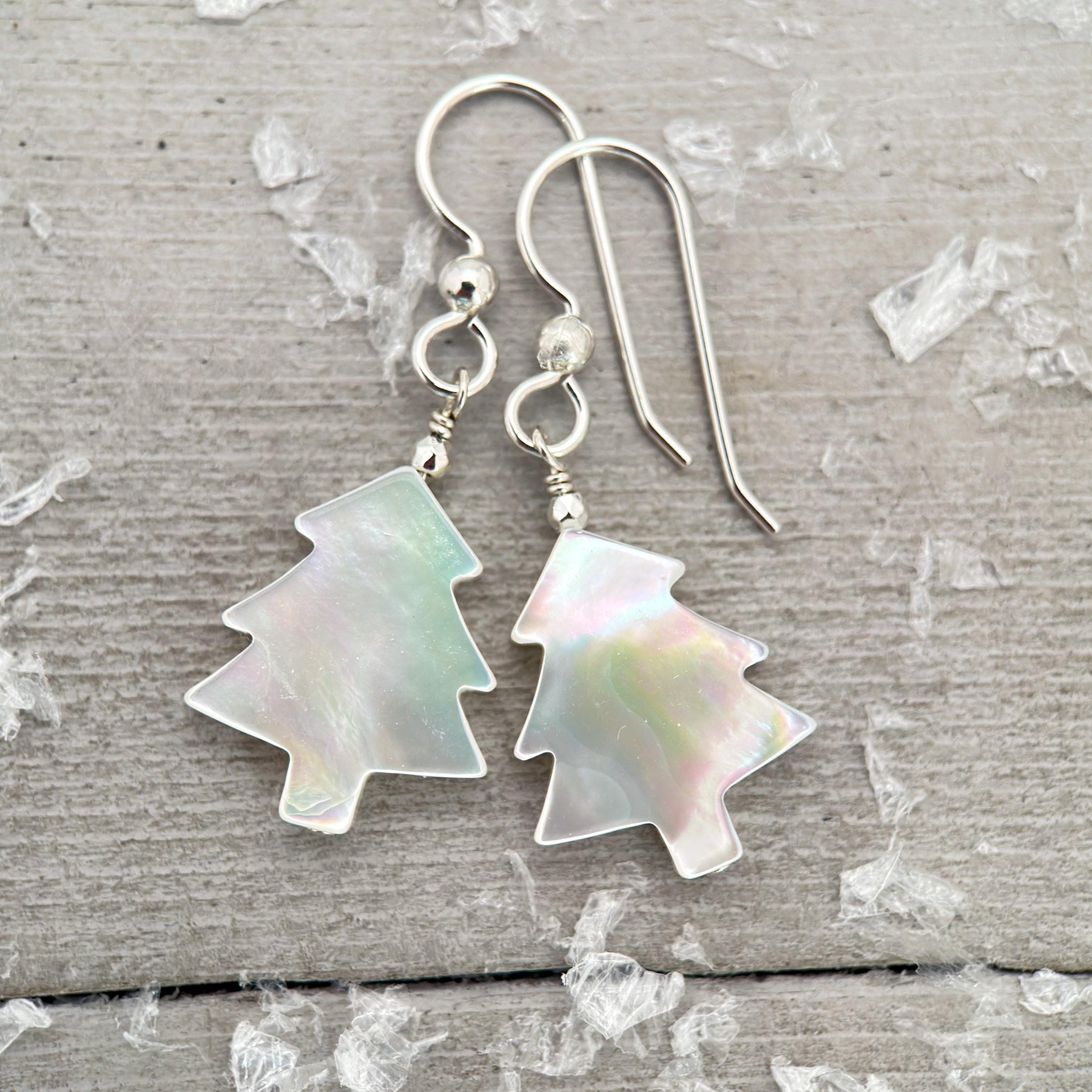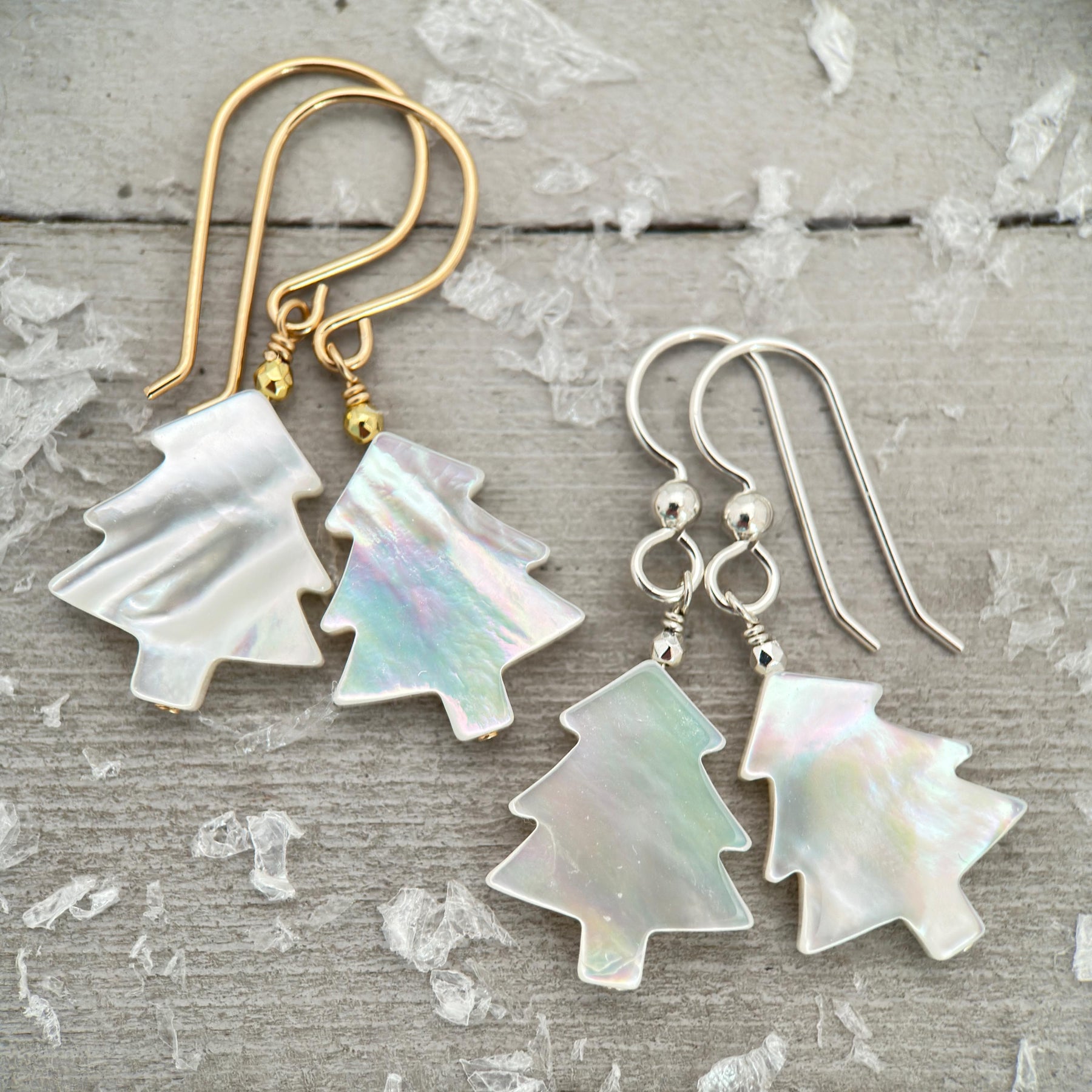 Limited edition: Shimmering Mother-of-Pearl pine tree earrings—perfect for winter outfits, holiday parties, and festive gifting.