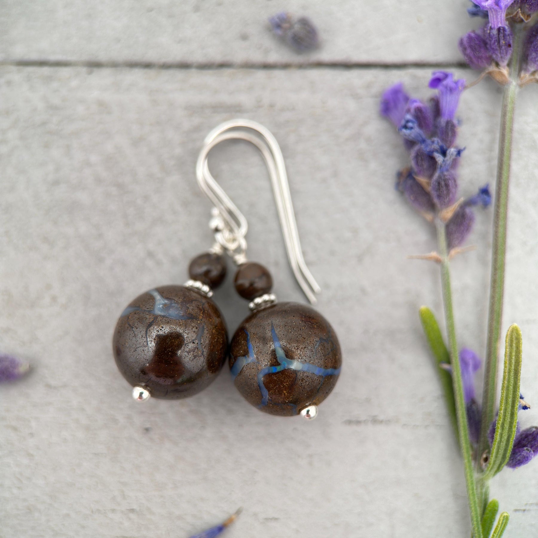 Stunning Australian Boulder Opal earrings set in sterling silver—handcrafted, natural, and full of earthy tones with flashes of vibrant opal.