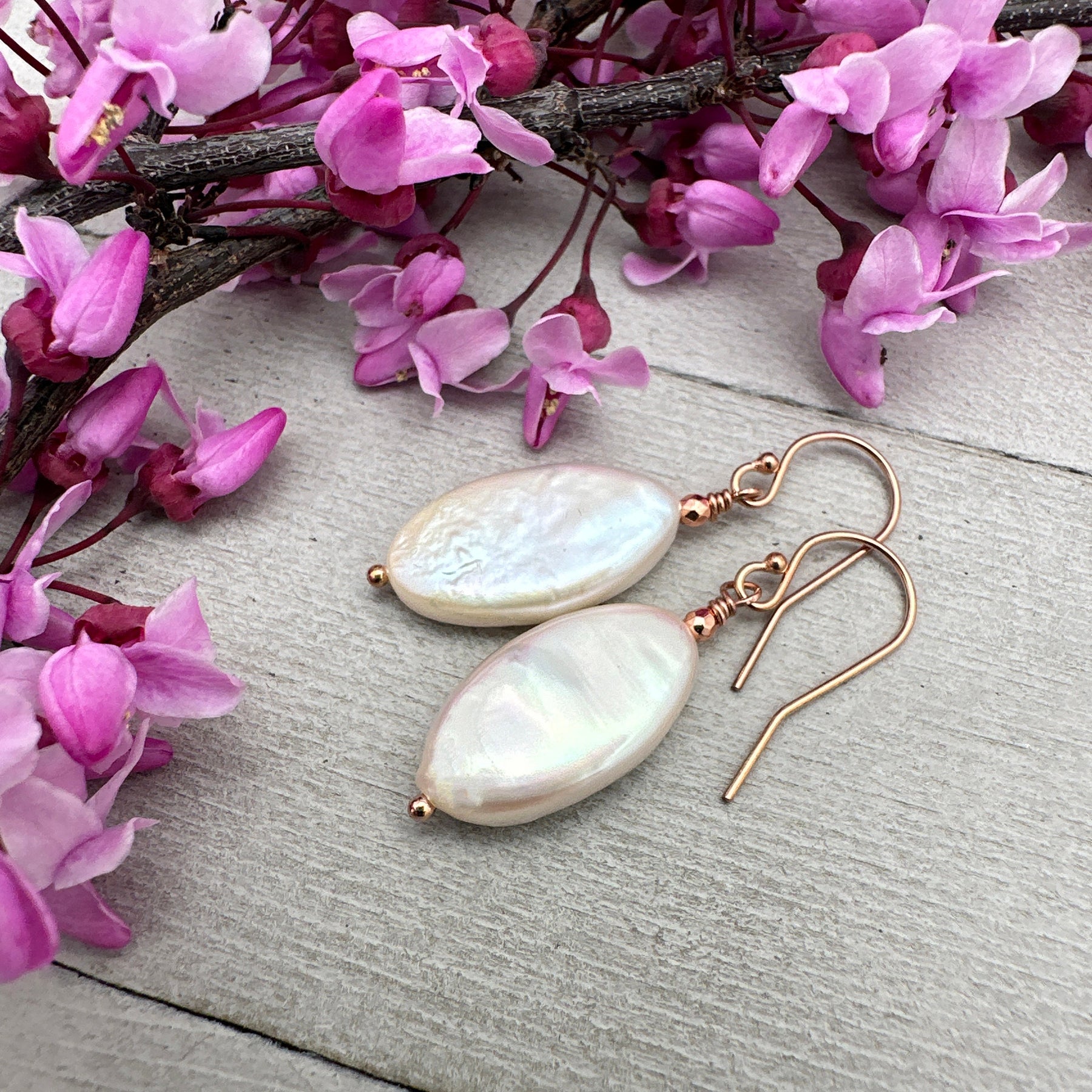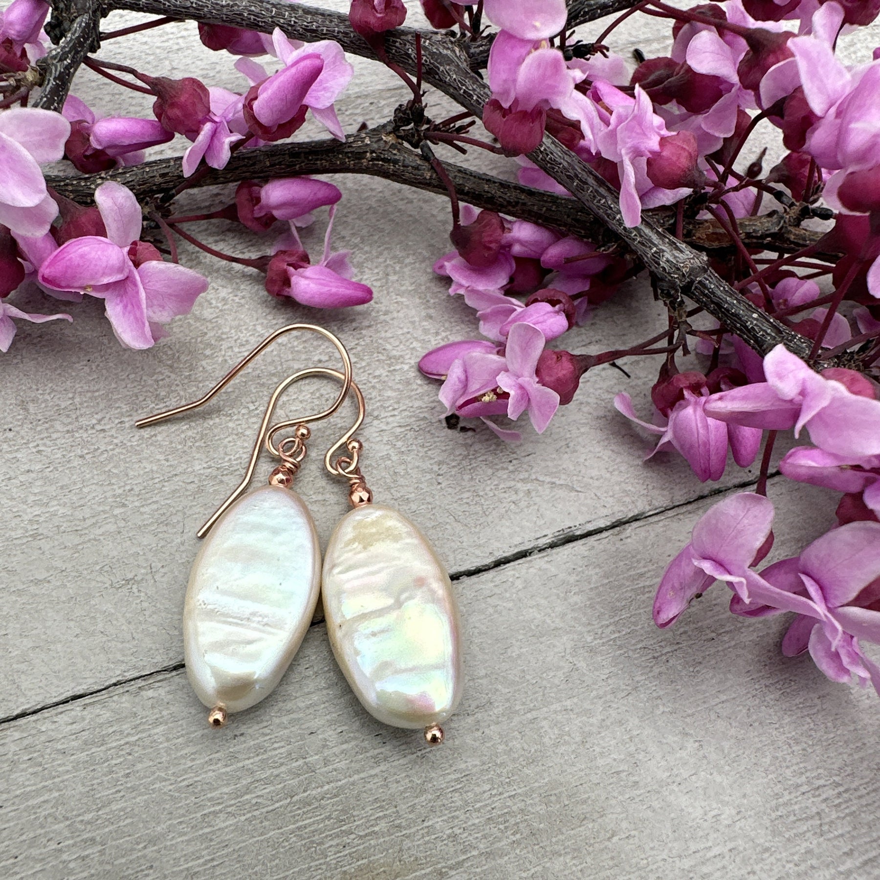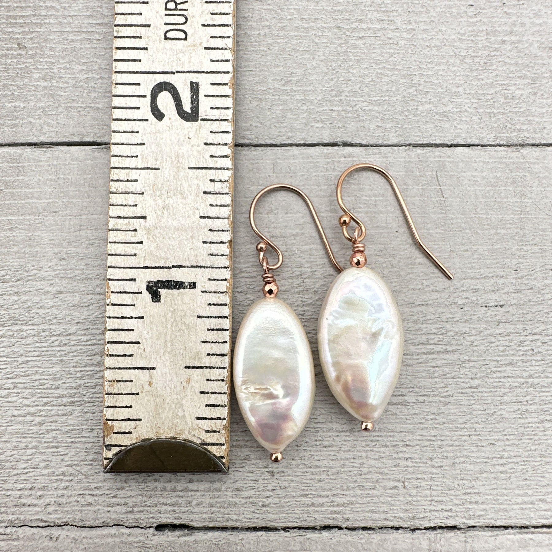 Gorgeous creamy champagne freshwater pearls with 14k rose gold fill. The large oval-shaped pearls are thick and have gorgeous nacre with rainbow colored orient to them. Accented beautifully with the 14k rose-gold fill.