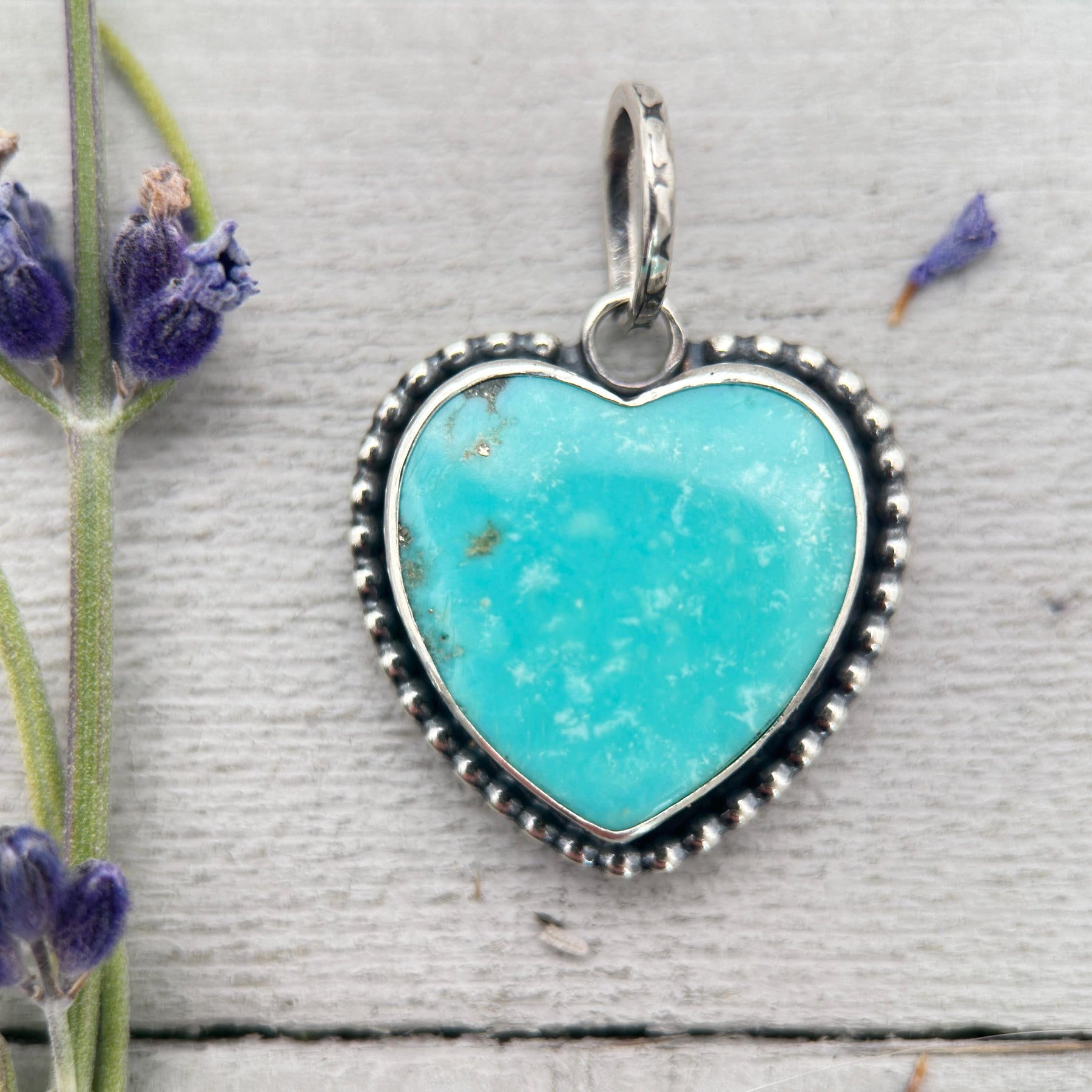 The turquoise heart is carefully set in solid 925 sterling silver and accented with silver granules around the stone, adding texture and handcrafted detail. A standout feature of this pendant is the spinning ring bail, designed to move freely—perfect for fidgety fingers and everyday wear.