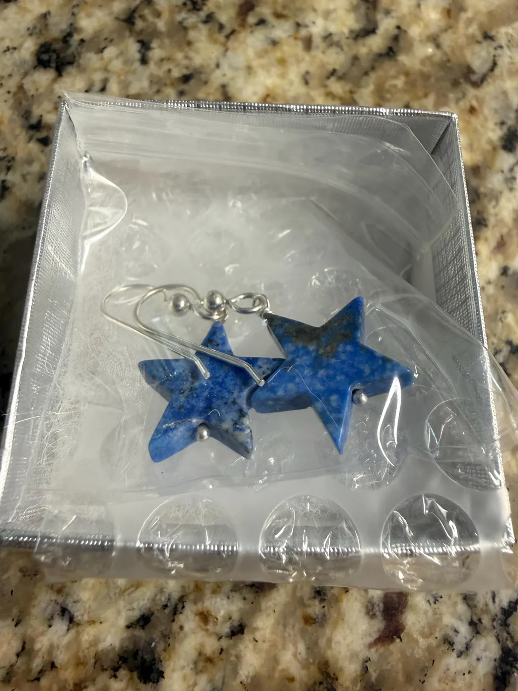 Gorgeous Lapis Lazuli stars flecked with gold-like stars in the night sky. All metal is 925 sterling silver.