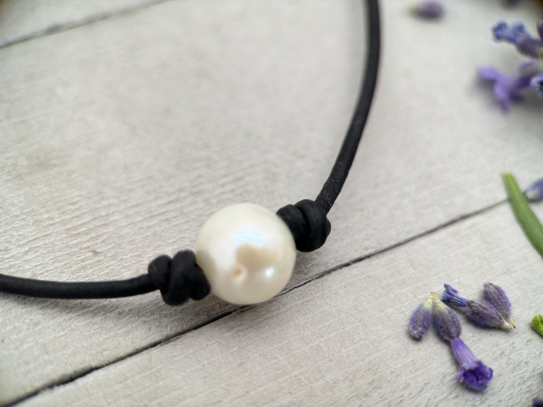 Simple, earthy, and elegant—this leather and pearl necklace features a single stunning white round pearl, measuring 11–12mm. The pearl is top quality, with radiant luster and thick nacre that glows in the light. Each one is hand-selected for its nearly smooth surface and natural beauty.