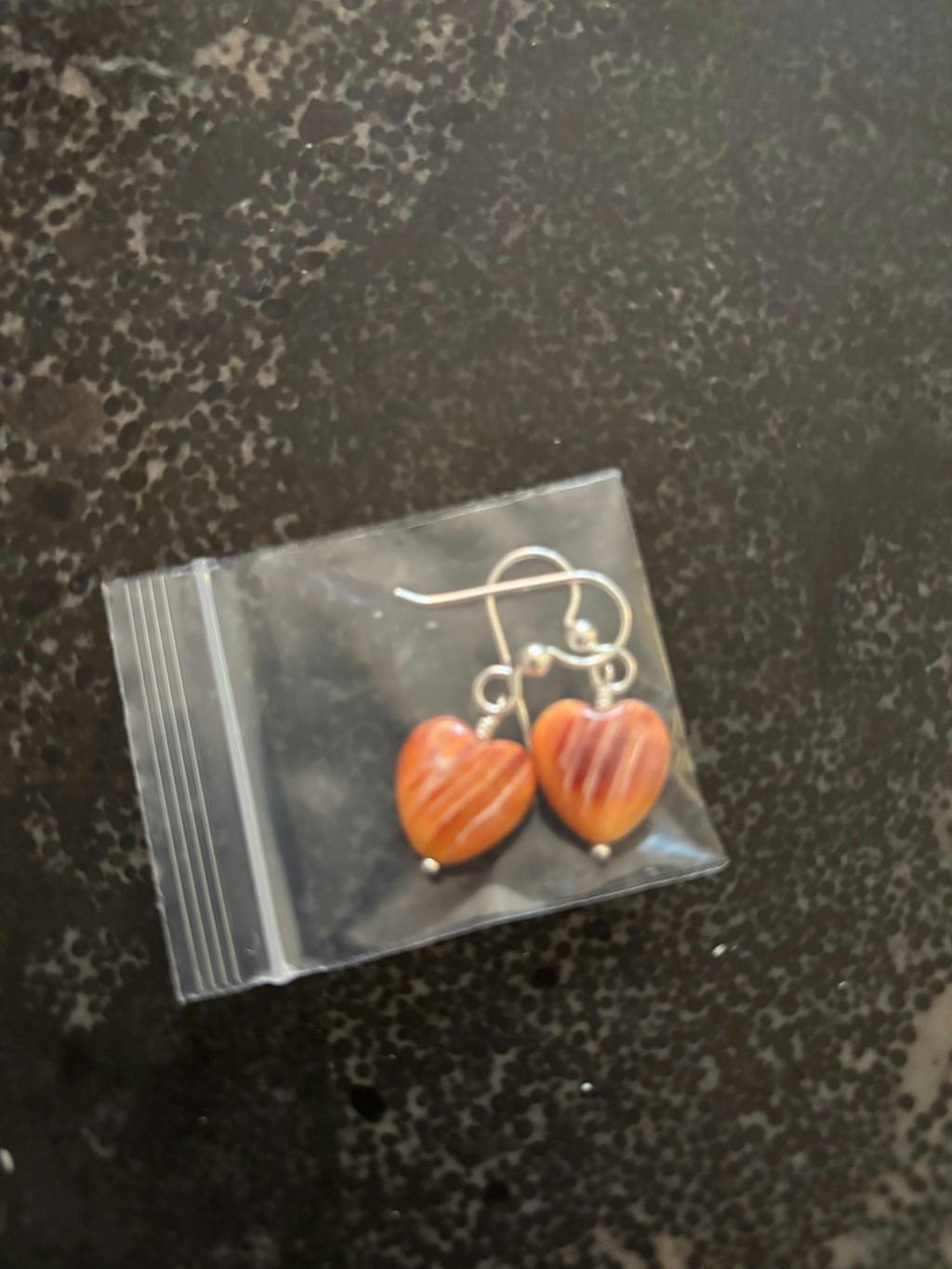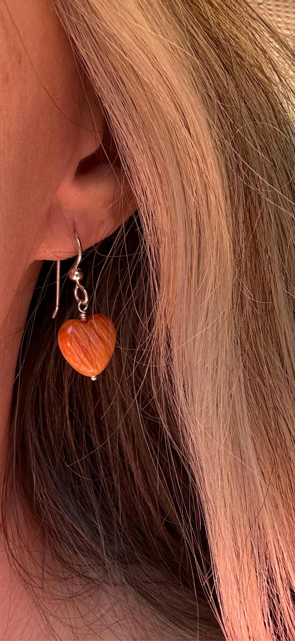 Pretty orange spiny oyster heart earrings. The spiny oyster hearts have beautiful colors and shapes. Some have red or white stripes in the orange and they are white on the back. Accented with shiny sterling silver. All metal is solid 925 sterling silver.