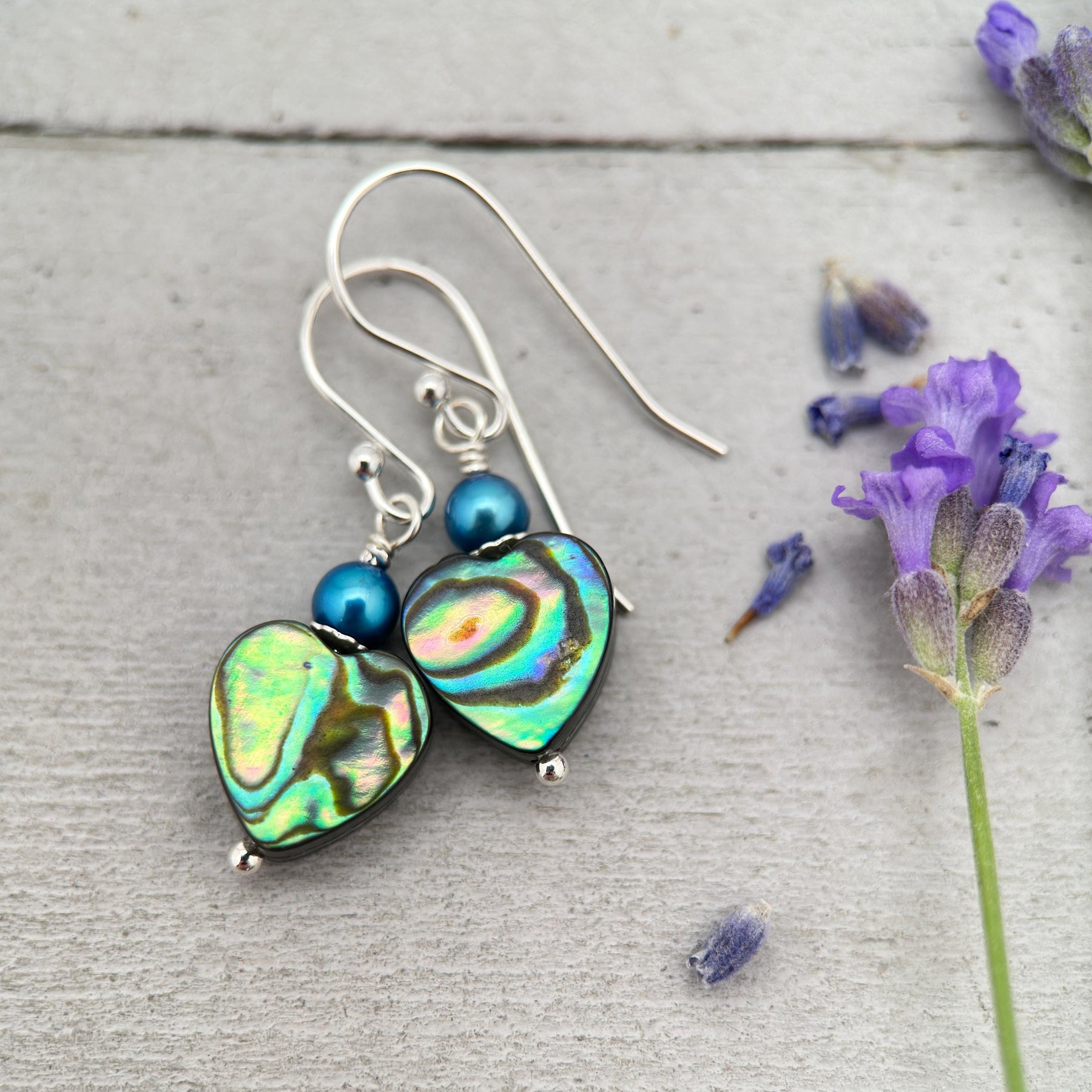 These handcrafted heart shaped Paua abalone shell earrings feature vibrant, natural shell beads paired with peacock blue pearls and solid 925 sterling silver for a stunning, ocean-inspired look. Known for its swirling rainbow of blues, greens, purples, and soft pinks, Paua shell reflects light like a peacock feather or opal—revealing dazzling colors from every angle.