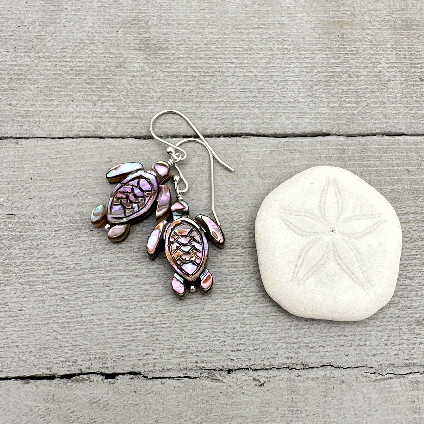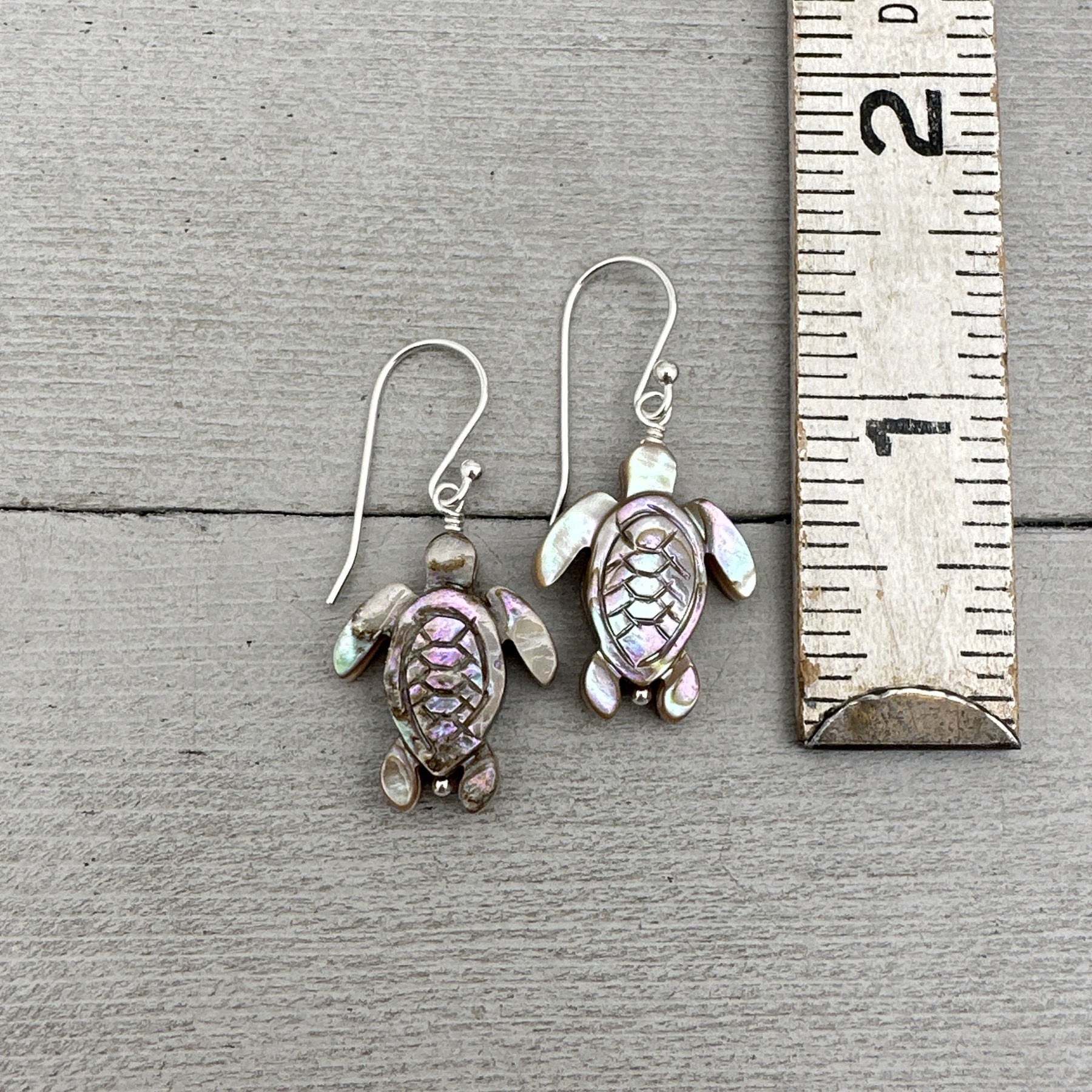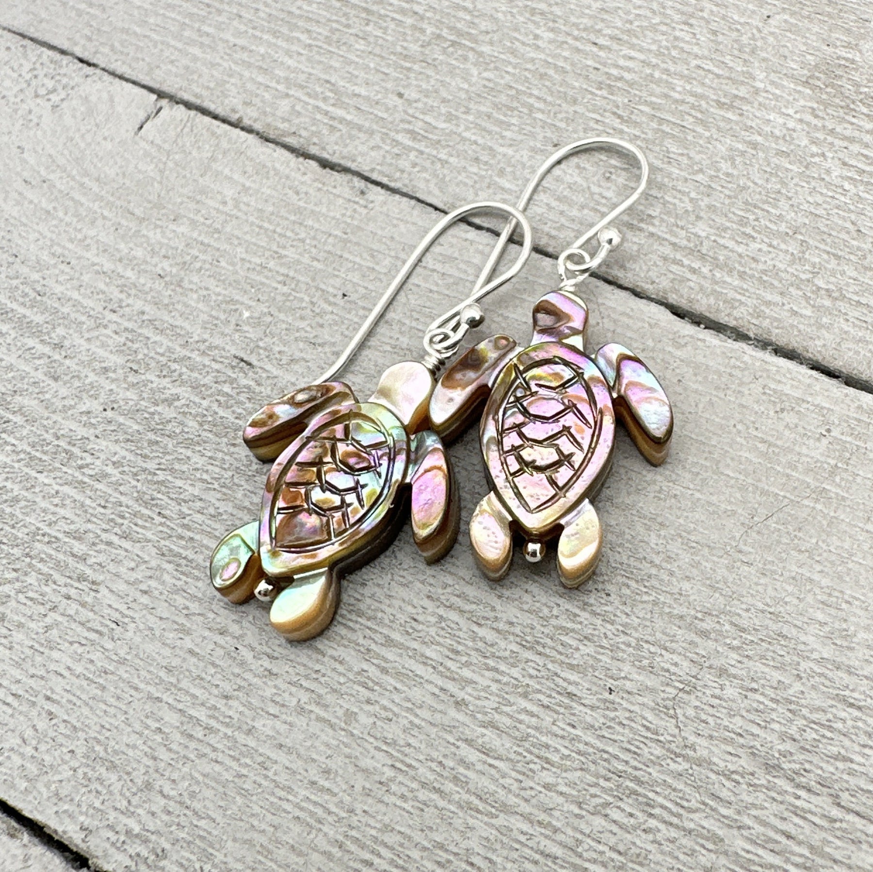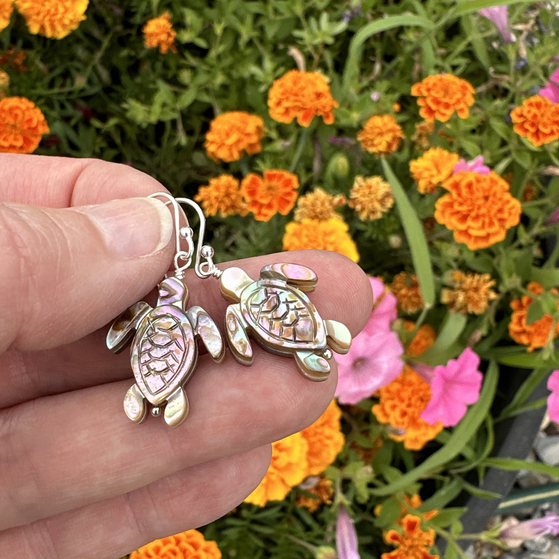 Cute sea turtles carved from abalone shells. The paua shells have a beautiful rainbow of colors. They dangle from silver ear wires. All metal is solid 925 sterling silver.
