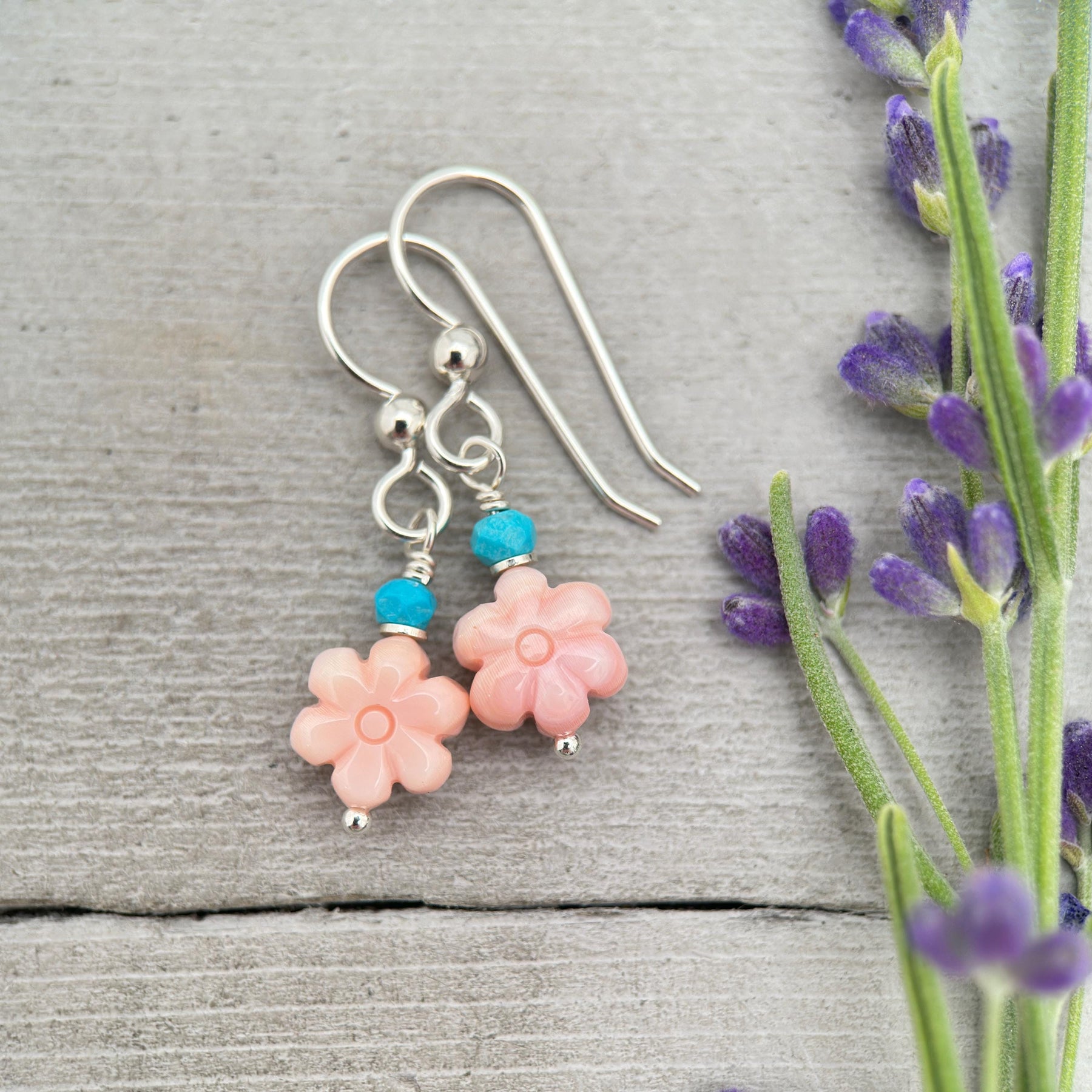 Handmade earrings featuring natural queen conch shell flowers paired with faceted turquoise beads and 925 sterling silver. The queen conch shell has a soft blush-pink color with carved flower details on both sides, while the turquoise adds a pop of bright blue reminiscent of the desert Southwest and the Caribbean sea. Finished with French ear wires, these earrings are lightweight, feminine, and perfect for everyday wear.