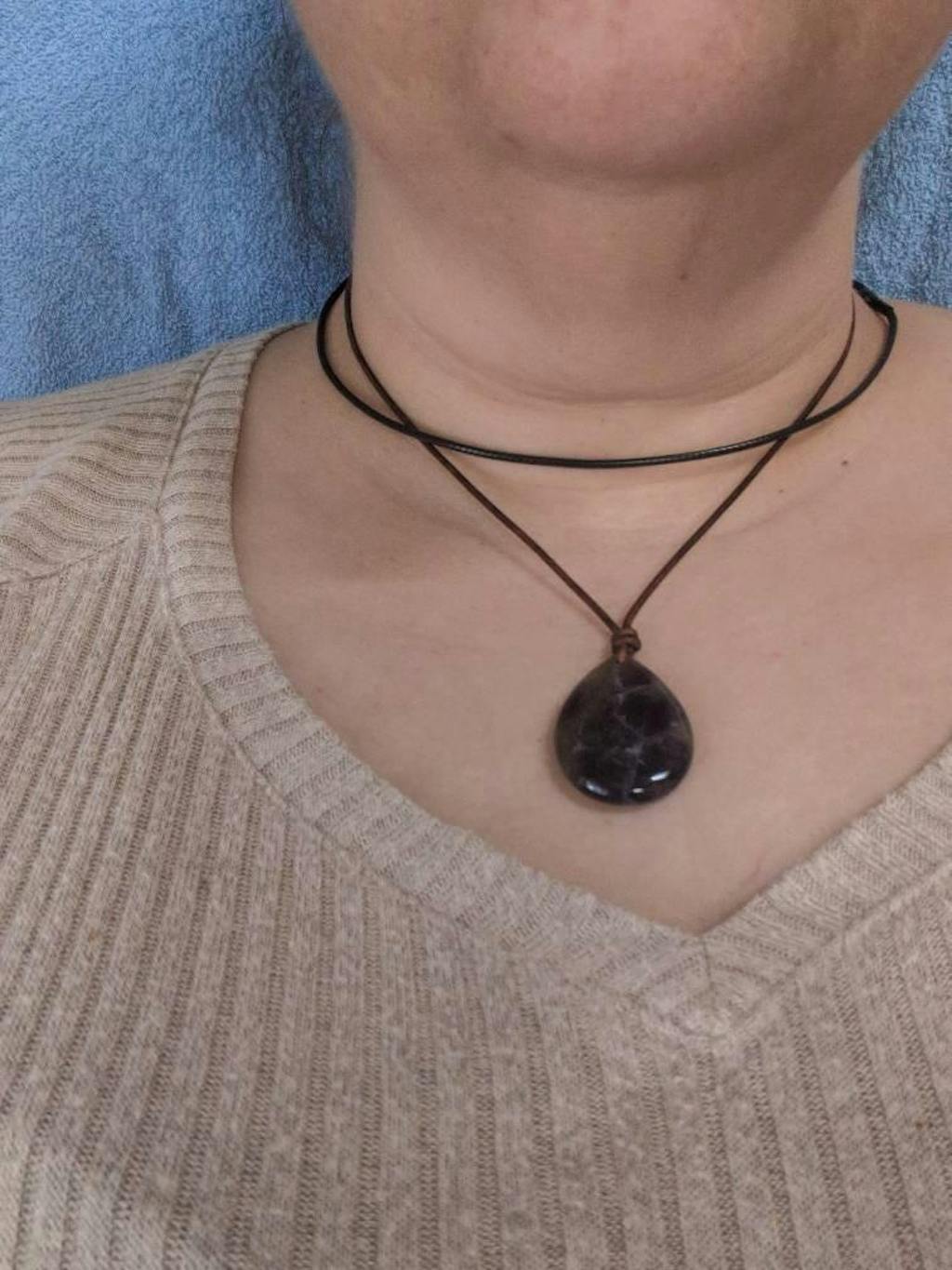 • Materials: Genuine amethyst, Karen Hill Tribe fine silver, brown leather cord
