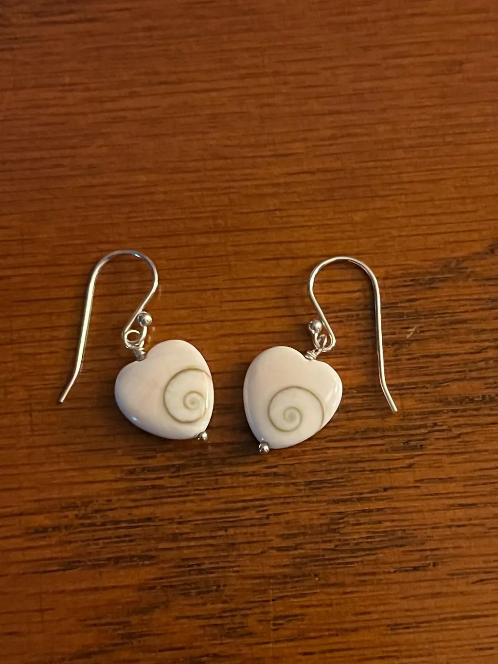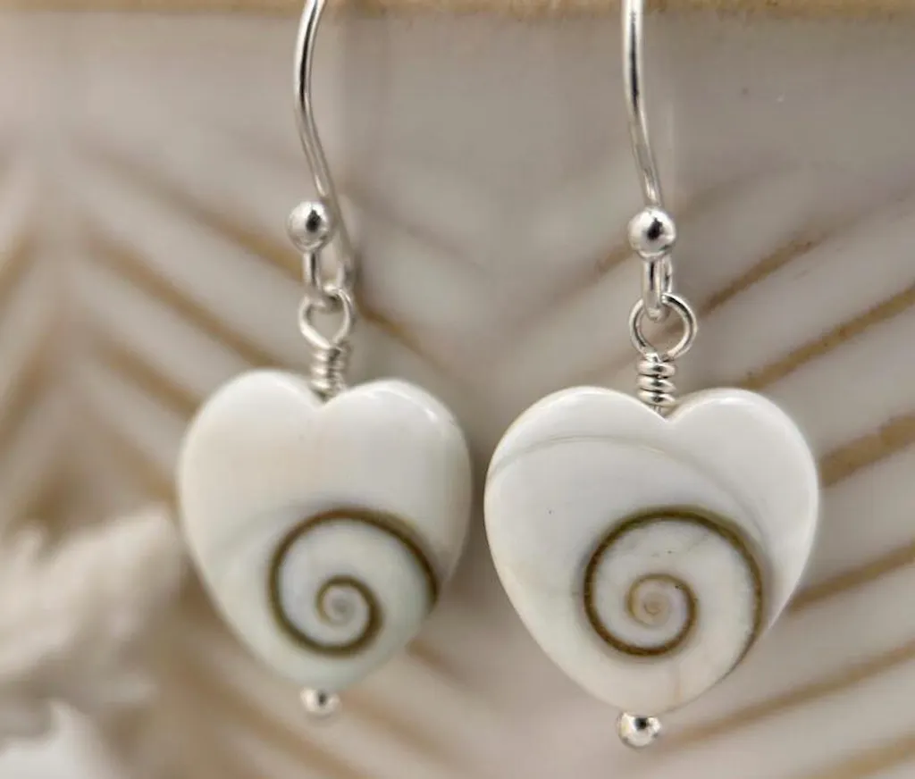Beautiful Shiva Eye shell and sterling silver earrings. The heart-shaped Shiva shells are creamy white in color with a brown and peach swirl. Matching necklaces shown in the photos are sold separately. All metal is solid 925 sterling silver.